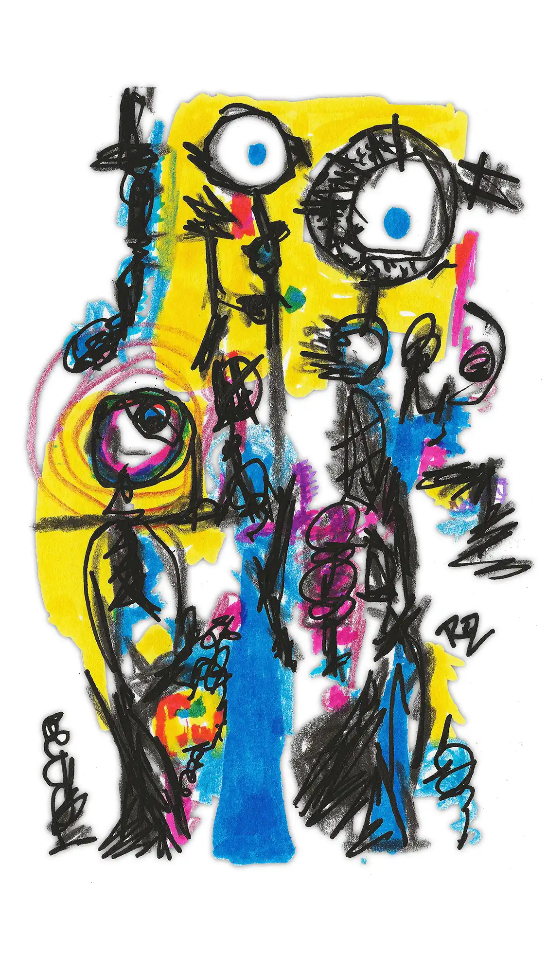 - Mixed media on paper, scanned and edited digitally.